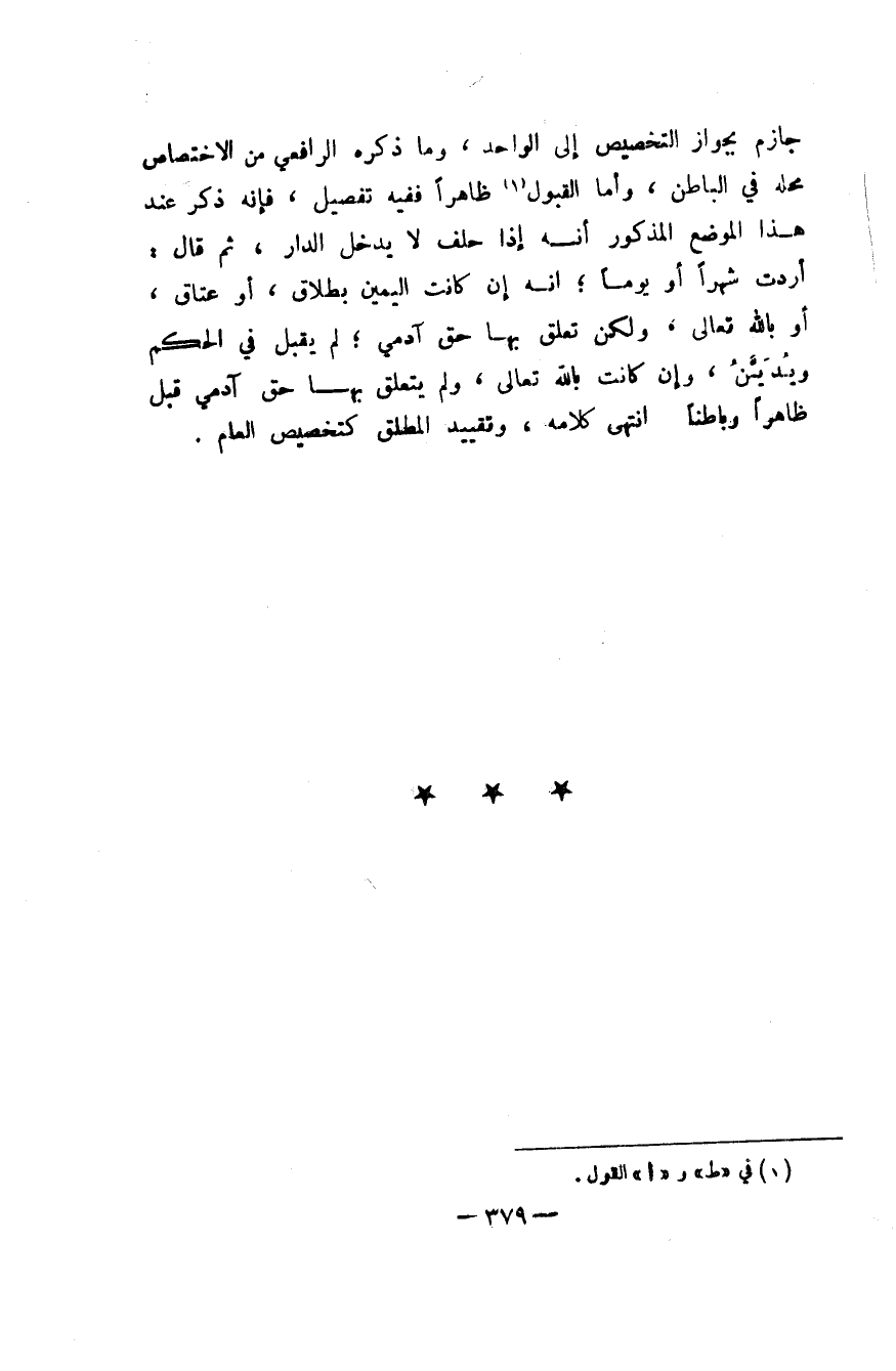 جازم بِجَوَاز التَّخْصِيص إِلَى الْوَاحِد وَمَا ذكره الرَّافِعِيّ من الِاخْتِصَاص مَحَله فِي الْبَاطِن وَأما الْقبُول ظَاهرا فَفِيهِ تَفْصِيل فَإِنَّهُ ذكر عِنْد هَذَا الْموضع الْمَذْكُور أَنه إِذا حلف لَا يدْخل الدَّار ثمَّ قَالَ أردْت شهرا أَو يَوْمًا أَنه إِن كَانَت الْيَمين بِطَلَاق أَو عتاق أَو بِاللَّه تَعَالَى وَلَكِن تعلق بهَا حق آدَمِيّ لم يقبل فِي الحكم ويدين وَإِن كَانَت بِاللَّه تَعَالَى وَلم يتَعَلَّق بهَا حق آدَمِيّ قبل ظَاهرا وَبَاطنا انْتهى كَلَامه وَتَقْيِيد الْمُطلق كتخصيص الْعَام