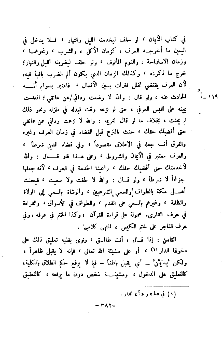 فِي كتاب الْأَيْمَان لَو حلف ليخمنه اللَّيْل وَالنَّهَار فَلَا يدْخل فِي الْيَمين مَا أخرجه الْعرف كزمان الْأكل وَالشرب وَنَحْوهمَا وزمان الاسْتِرَاحَة وَالنَّوْم المألوف وَلَو حلف ليضربنه اللَّيْل وَالنَّهَار خرج مَا ذَكرْنَاهُ وَكَذَلِكَ الزَّمَان الَّذِي يكون ألم الضَّرْب بَاقِيا فِيهِ لِأَن الْعرف يَقْتَضِي تخَلّل فترات بَين الْأَفْعَال فَاعْتبر بدوام ألمه الْحَادِث عَنهُ وَلَو قَالَ وَالله لَا وضعت رِدَائي عَن عَاتِقي انْعَقَدت يَمِينه على اللّبْس الْعرفِيّ حَتَّى لَو نَزعه وَقت تبذله فِي منزله وَنَحْو ذَلِك لم يَحْنَث بِخِلَاف مَا لوقال لغريمه وَالله لَا نزعت رِدَائي عَن عَاتِقي حَتَّى أقضيك حَقك حنث بالنزع قبل الْقَضَاء فِي زمَان الْعرف وَغَيره وَالْفرق أَنه جعله فِي الْإِطْلَاق مَقْصُودا وَفِي قَضَاء الدّين شرطا وَالْعرْف مُعْتَبر فِي الْأَيْمَان والشروط وعَلى هَذَا فَلَو قَالَ وَالله لأخدمنك حَتَّى أقضيك حَقك راعينا الْخدمَة فِي الْعرف لِأَنَّهُ جعلهَا جزاءا لَا شرطا وَلَو قَالَ وَالله لَا طفت وَلَا سعيت فَيحنث أهل مَكَّة بِالطّوافِ وَالسَّعْي الشرعيين والوشاة بالسعي إِلَى الْوُلَاة والظلمة وَغَيرهم بالسعي على الْقدَم وَالطّواف فِي الْأَسْوَاق وَالْقِرَاءَة فِي عرف القارىء مَحْمُولَة على قِرَاءَة الْقُرْآن وَكَذَا الْخَتْم فِي عرفه وَفِي عرف التَّاجِر على ختم الْكيس انْتهى كَلَامهمَا