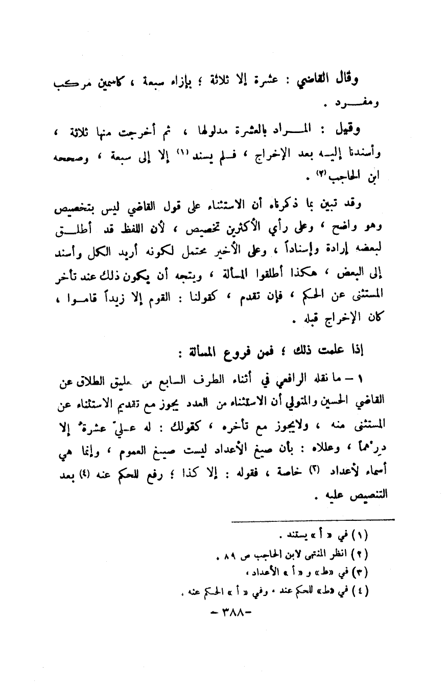 1 - مَا نَقله الرَّافِعِيّ فِي أثْنَاء الطّرف السَّابِع من تَعْلِيق الطَّلَاق عَن القَاضِي الْحُسَيْن وَالْمُتوَلِّيّ أَن الِاسْتِثْنَاء من الْعدَد يجوز مَعَ تَقْدِيم الِاسْتِثْنَاء عَن الْمُسْتَثْنى مِنْهُ وَلَا يجوز مَعَ تَأَخره كَقَوْلِك لَهُ عَليّ عشرَة إِلَّا درهما وعللاه بِأَن صِيغ الْأَعْدَاد لَيست صِيغ الْعُمُوم وَإِنَّمَا هِيَ أَسمَاء لأعداد خَاصَّة فَقَوله إِلَّا كَذَا رفع للْحكم عَنهُ بعد التَّنْصِيص عَلَيْهِ