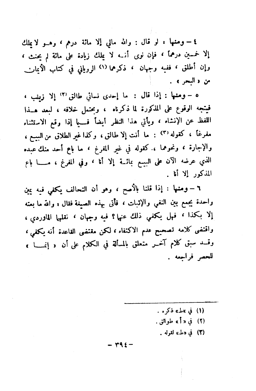 4 - وَمِنْهَا لَو قَالَ وَالله مَالِي إِلَّا مائَة دِرْهَم وَهُوَ لَا يملك إِلَّا خمسين درهما فَإِن نوى أَنه لَا يملك زِيَادَة على مائَة لم يَحْنَث وَإِن أطلق فَفِيهِ وَجْهَان ذكرهمَا الرَّوْيَانِيّ فِي كتاب الْأَيْمَان من الْبَحْر
