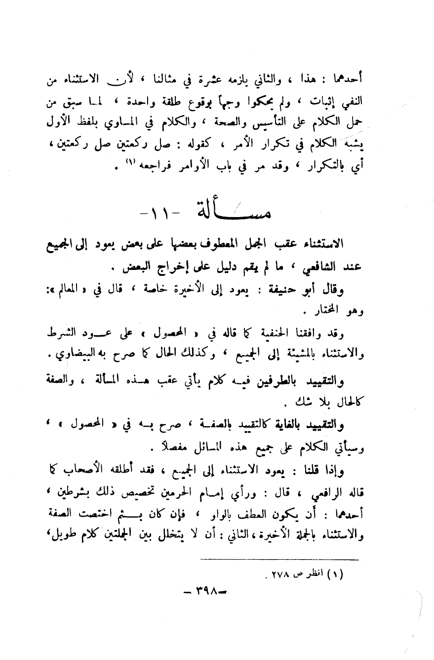 وَإِذا قُلْنَا يعود الِاسْتِثْنَاء إِلَى الْجَمِيع فقد أطلقهُ الْأَصْحَاب كَمَا قَالَه الرَّافِعِيّ قَالَ ورأي إِمَام الْحَرَمَيْنِ تَخْصِيص ذَلِك بِشَرْطَيْنِ أَحدهمَا أَن يكون الْعَطف بِالْوَاو فَإِن كَانَ بثم اخْتصّت الصّفة وَالِاسْتِثْنَاء بِالْجُمْلَةِ الْأَخِيرَة الثَّانِي أَن لَا يَتَخَلَّل بَين الجملتين كَلَام طَوِيل