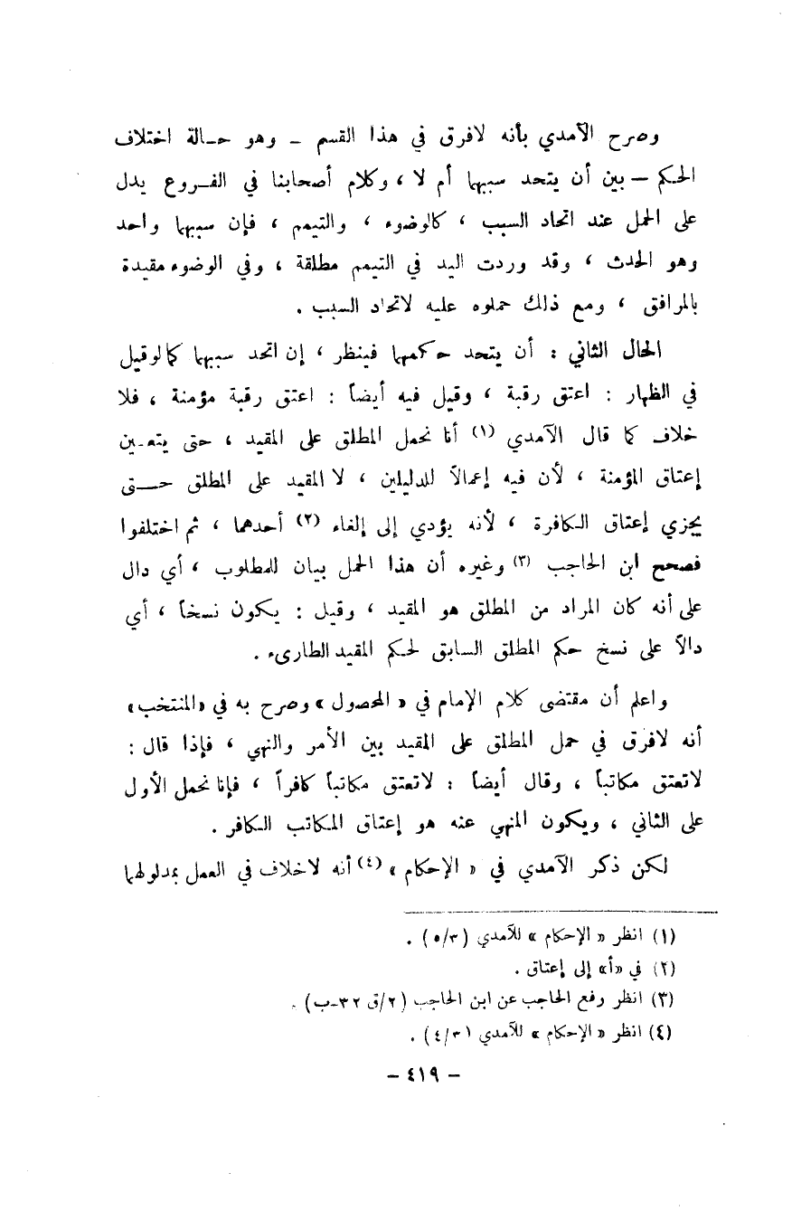 الْحَال الثَّانِي أَن يتحد حكمهمَا فَينْظر إِن اتَّحد سببهما كَمَا لَو قيل فِي الظِّهَار اعْتِقْ رَقَبَة وَقيل فِيهِ أَيْضا اعْتِقْ رَقَبَة مُؤمنَة فَلَا خلاف كَمَا قَالَ الْآمِدِيّ أَنا نحمل الْمُطلق على الْمُقَيد حَتَّى يتَعَيَّن إِعْتَاق المؤمنة لِأَن فِيهِ إعمالا للدليلين لَا الْمُقَيد على الْمُطلق حَتَّى يَجْزِي إِعْتَاق الْكَافِرَة لِأَنَّهُ يُؤَدِّي إِلَى إِلْغَاء أَحدهمَا ثمَّ اخْتلفُوا فصحح ابْن الْحَاجِب وَغَيره أَن هَذَا الْحمل بَيَان للمطلوب أَي دَال على أَنه كَانَ المُرَاد من الْمُطلق هُوَ الْمُقَيد وَقيل يكون نسخا أَي دَالا على نسخ حكم الْمُطلق السَّابِق لحكم الْمُقَيد الطارىء