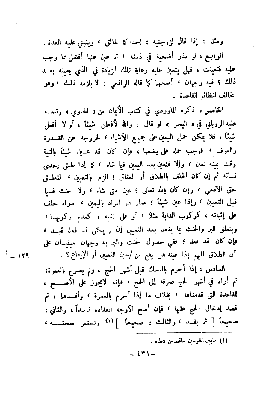الْخَامِس ذكره الْمَاوَرْدِيّ فِي كتاب الْأَيْمَان من الْحَاوِي وَتَبعهُ عَلَيْهِ الرَّوْيَانِيّ فِي الْبَحْر لَو قَالَ وَالله لَأَفْعَلَنَّ شَيْئا أَو لَا أفعل شَيْئا فَلَا يُمكن حمل الْيَمين على جَمِيع الْأَشْيَاء لِخُرُوجِهِ عَن الْقُدْرَة وَالْعرْف فَوَجَبَ حمله على بَعْضهَا فَإِن كَانَ قد عين شَيْئا بِالنِّيَّةِ وَقت يَمِينه تعين وَإِلَّا فَتعين بعد الْيَمين فِيمَا شَاءَ كَمَا إِذا طلق إِحْدَى نِسَائِهِ ثمَّ إِن كَانَ الْحلف بِالطَّلَاق أَو الْعتاق الزم بِالتَّعْيِينِ لتَعلق حق الْآدَمِيّ وَإِن كَانَ بِاللَّه تَعَالَى عين مَتى شَاءَ وَلَا حنث فِيمَا قبل التَّعْيِين وَإِذا عين شَيْئا صَار هُوَ المُرَاد بِالْيَمِينِ سَوَاء حلف على إثْبَاته كركوب الدَّابَّة مثلا أَو على نَفْيه كَعَدم ركُوبهَا وَيتَعَلَّق الْبر والحنث بِمَا يَفْعَله بعد التَّعْيِين إِن لم يكن قد فعله قبله فَإِن كَانَ قد فعله فَفِي حُصُول الْحِنْث وَالْبر بِهِ وَجْهَان مبنيان على أَن الطَّلَاق الْمُبْهم إِذا عينه هَل يَقع من حِين التَّعْيِين أَو الْإِيقَاع