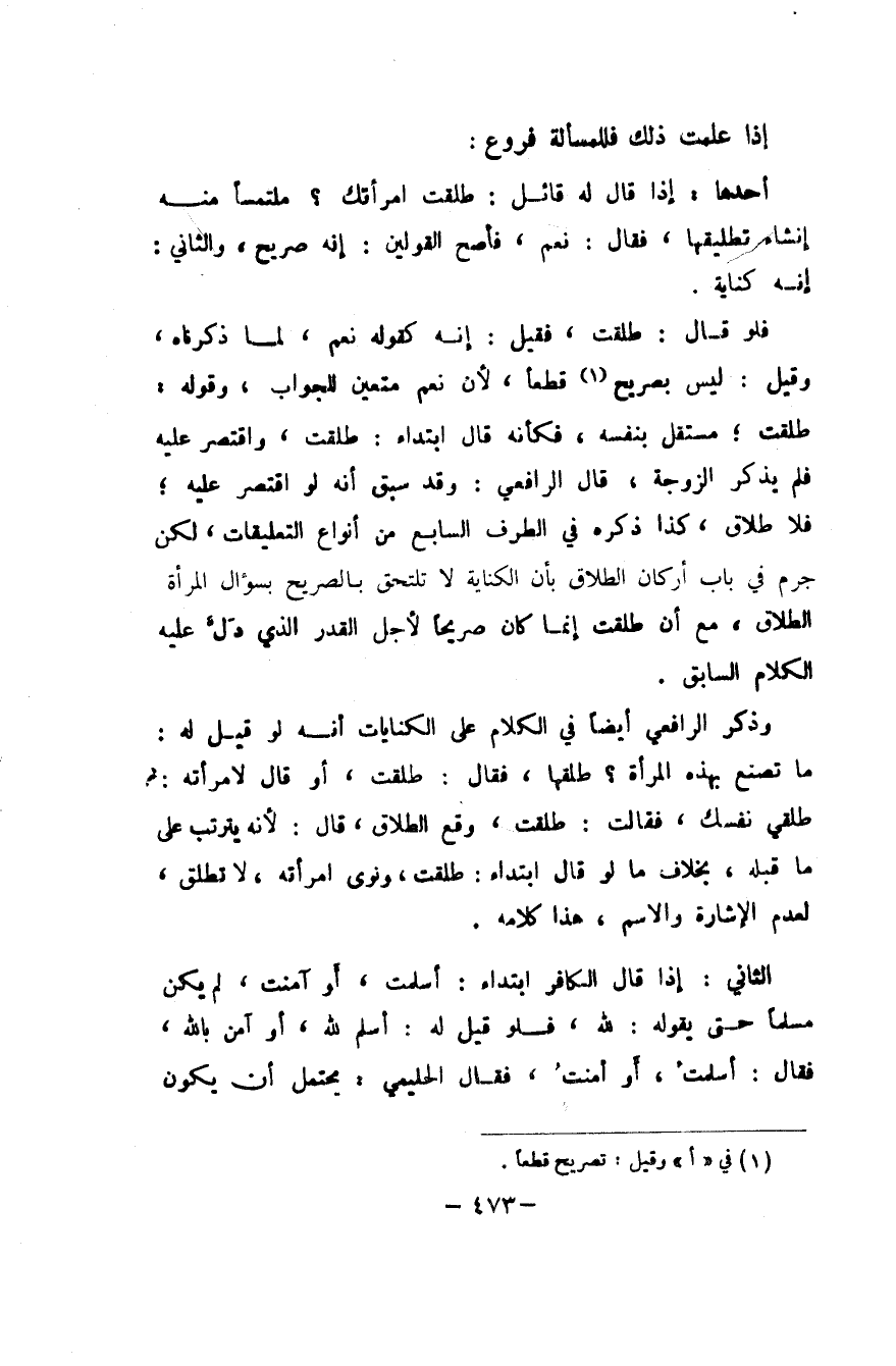 أَحدهَا إِذا قَالَ لَهُ قَائِل طلقت امْرَأَتك ملتمسا مِنْهُ انشاء تطليقها فَقَالَ نعم فأصح الْقَوْلَيْنِ إِنَّه صَرِيح وَالثَّانِي إِنَّه كِنَايَة