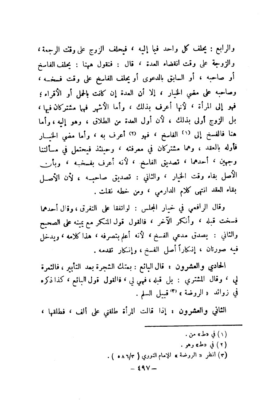 وَالرَّابِع يحلف كل وَاحِد فِيمَا إِلَيْهِ فَيحلف الزَّوْج على وَقت الرّجْعَة وَالزَّوْجَة على وَقت انْقِضَاء الْعدة قَالَ فَنَقُول هَهُنَا يحلف الفاسخ أَو صَاحبه أَو السَّابِق بِالدَّعْوَى أَو يحلف الفاسخ على وَقت فَسخه وَصَاحبه على مُضِيّ الْخِيَار إِلَّا أَن الْعدة إِن كَانَت بِالْحملِ أَو الْأَقْرَاء فَهُوَ إِلَى الْمَرْأَة لِأَنَّهَا أعرف بذلك وَأما الْأَشْهر فهما مشتركان فِيهَا بل الزَّوْج أولى بذلك لِأَن أول الْعدة من الطَّلَاق وَهُوَ إِلَيْهِ وَأما هُنَا فالفسخ إِلَى الفاسخ فَهُوَ أعرف بِهِ وَأما مُضِيّ الْخِيَار فأوله بِالْعقدِ وهما مشتركان فِي مَعْرفَته وَحِينَئِذٍ فَيحْتَمل فِي مَسْأَلَتنَا وَجْهَيْن أَحدهمَا تَصْدِيق الفاسخ لِأَنَّهُ أعرف بفسخه وَبِأَن الأَصْل بَقَاء وَقت الْخِيَار وَالثَّانِي تَصْدِيق صَاحبه لِأَن الأَصْل بَقَاء العقد انْتهى كَلَام الدَّارمِيّ وَمن خطة نقلت