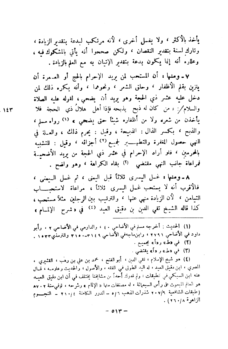 7 - وَمِنْهَا أَن الْمُسْتَحبّ لمن يُرِيد الاحرام بِالْحَجِّ أَو الْعمرَة أَن يتزين بقلم الْأَظْفَار وَحلق الشّعْر وَنَحْوهمَا وَأَنه يكره ذَلِك لمن دخل عَلَيْهِ عشر ذِي الْحجَّة وَهُوَ يُرِيد أَن يُضحي لقَوْله عَلَيْهِ الصَّلَاة وَالسَّلَام من كَانَ لَهُ ذبح يذبحه فَإِذا أهل هِلَال ذِي الْحجَّة فَلَا يَأْخُذن من شعره وَلَا من أَظْفَاره شَيْئا حَتَّى يُضحي رَوَاهُ مُسلم وَالذّبْح بِكَسْر الذَّال الذَّبِيحَة وَقيل يحرم ذَلِك وَالْعلَّة فِي النَّهْي حُصُول الْمَغْفِرَة والتطهير لجَمِيع أَجْزَائِهِ وَقيل للتشبيه بالمحرمين فَلَو أَرَادَ الْإِحْرَام فِي عشر ذِي الْحجَّة من يُرِيد الْأُضْحِية فمراعاة جَانب النَّهْي مقتضي بَقَاء الْكَرَاهَة وَهُوَ وَاضح