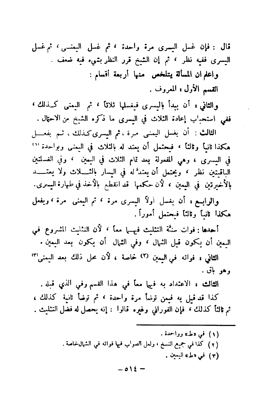 الثَّالِث أَن يغسل الْيُمْنَى مرّة ثمَّ الْيُسْرَى كَذَلِك ثمَّ يفعل هَكَذَا ثَانِيًا وثالثا فَيحْتَمل أَن يعْتد لَهُ بِالثلَاثِ فِي الْيُمْنَى وبواحدة فِي الْيُسْرَى وَهِي المفعولة بعد تَمام الثَّلَاث فِي الْيَمين وَفِي الغسلتين الْبَاقِيَتَيْنِ نظر وَيحْتَمل أَن يعْتد لَهُ فِي الْيَسَار بِالثلَاثِ وَلَا يعْتد بالأخيرتين فِي الْيَمين لِأَن حكمهَا قد انْقَطع بِالْأَخْذِ فِي طَهَارَة الْيُسْرَى