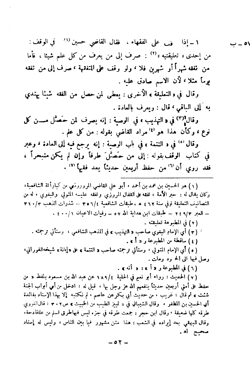 وَقَالَ فِي التَّتِمَّة فِي بَاب الْوَصِيَّة إِنَّه يرجع فِيهِ إِلَى الْعَادة وَعبر فِي كتاب الْوَقْف بقوله إِلَى من حصل طرفا وَإِن لم يكن متبحرا فقد رُوِيَ أَن من حفظ أَرْبَعِينَ حَدِيثا يعد فَقِيها