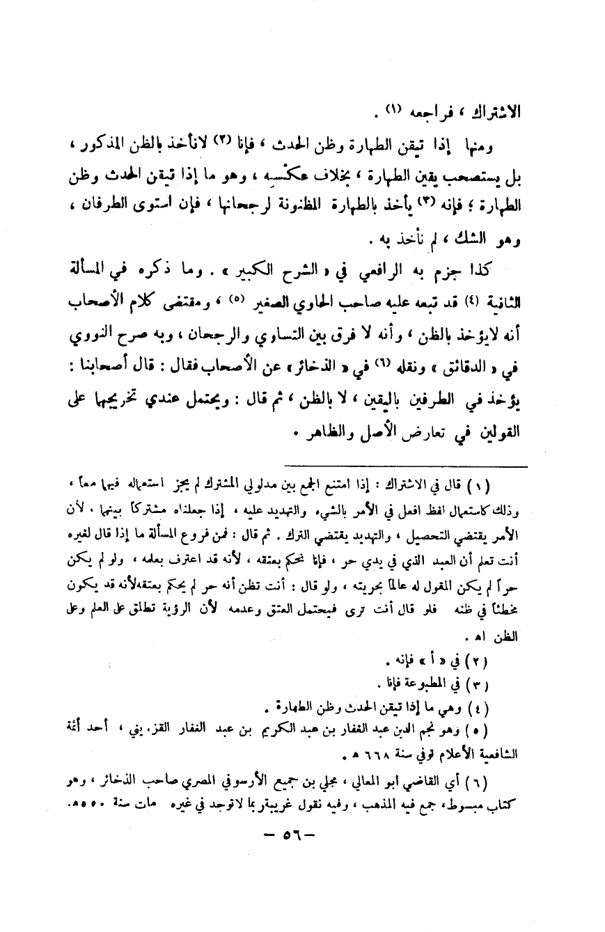 وَمِنْهَا إِذا تَيَقّن الطَّهَارَة وَظن الحَدِيث فَإنَّا لَا نَأْخُذ بِالظَّنِّ الْمَذْكُور بل يستصحب يَقِين الطَّهَارَة بِخِلَاف عَكسه وَهُوَ مَا إِذا تَيَقّن الْحَدث وَظن الطَّهَارَة فَإِنَّهُ يَأْخُذ بِالطَّهَارَةِ المظنونة لرجحانها فَإِن اسْتَوَى الطرفان وَهُوَ الشَّك لم نَأْخُذ بِهِ