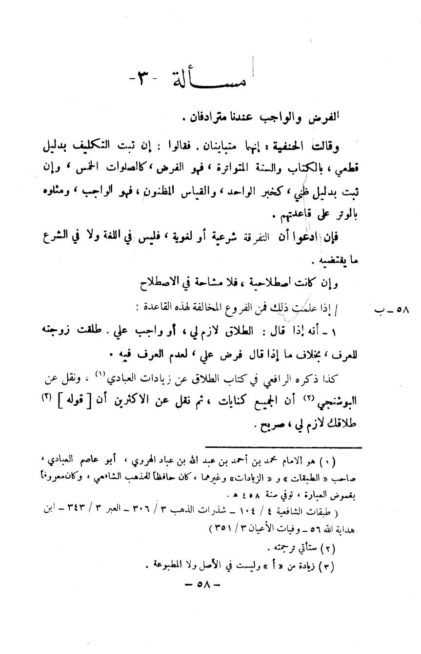 1 - أَنه إِذا قَالَ الطَّلَاق لَازم لي أَو وَاجِب عَليّ طلقت زَوجته للْعُرْف بِخِلَاف مَا إِذا قَالَ فرض عَليّ لعدم الْعرف فِيهِ