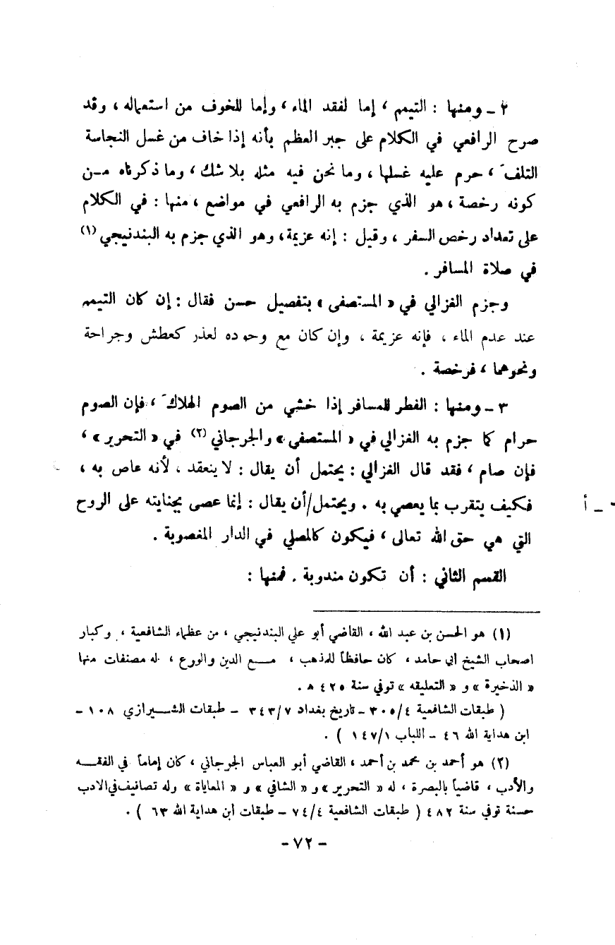 2 - وَمِنْهَا التَّيَمُّم إِمَّا لفقد المَاء وَإِمَّا للخوف من اسْتِعْمَاله وَقد صرح الرَّافِعِيّ فِي الْكَلَام على جبر الْعظم بانه إِذا خَافَ من غسل النَّجَاسَة التّلف حرم عَلَيْهِ غسلهَا وَمَا نَحن فِيهِ مثله بِلَا شكّ وَمَا ذَكرْنَاهُ من كَونه رخصَة هُوَ الَّذِي جزم بِهِ الرَّافِعِيّ فِي مَوَاضِع مِنْهَا فِي الْكَلَام على تعداد رخص السّفر وَقيل إِنَّه عَزِيمَة وَهُوَ الَّذِي جزم بِهِ الْبَنْدَنِيجِيّ فِي صَلَاة الْمُسَافِر