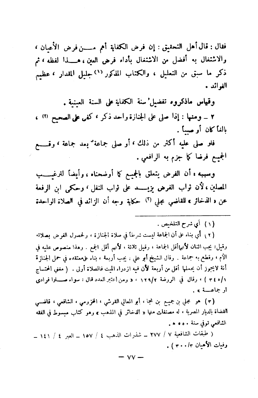 فَقَالَ قَالَ أهل التَّحْقِيق إِن فرض الْكِفَايَة أهم من فرض الْأَعْيَان والاشتغال بِهِ أفضل من الِاشْتِغَال بأَدَاء فرض الْعين هَذَا لَفظه ثمَّ ذكر مَا سبق من التَّعْلِيل وَالْكتاب الْمَذْكُور جليل الْمِقْدَار عَظِيم الْفَوَائِد