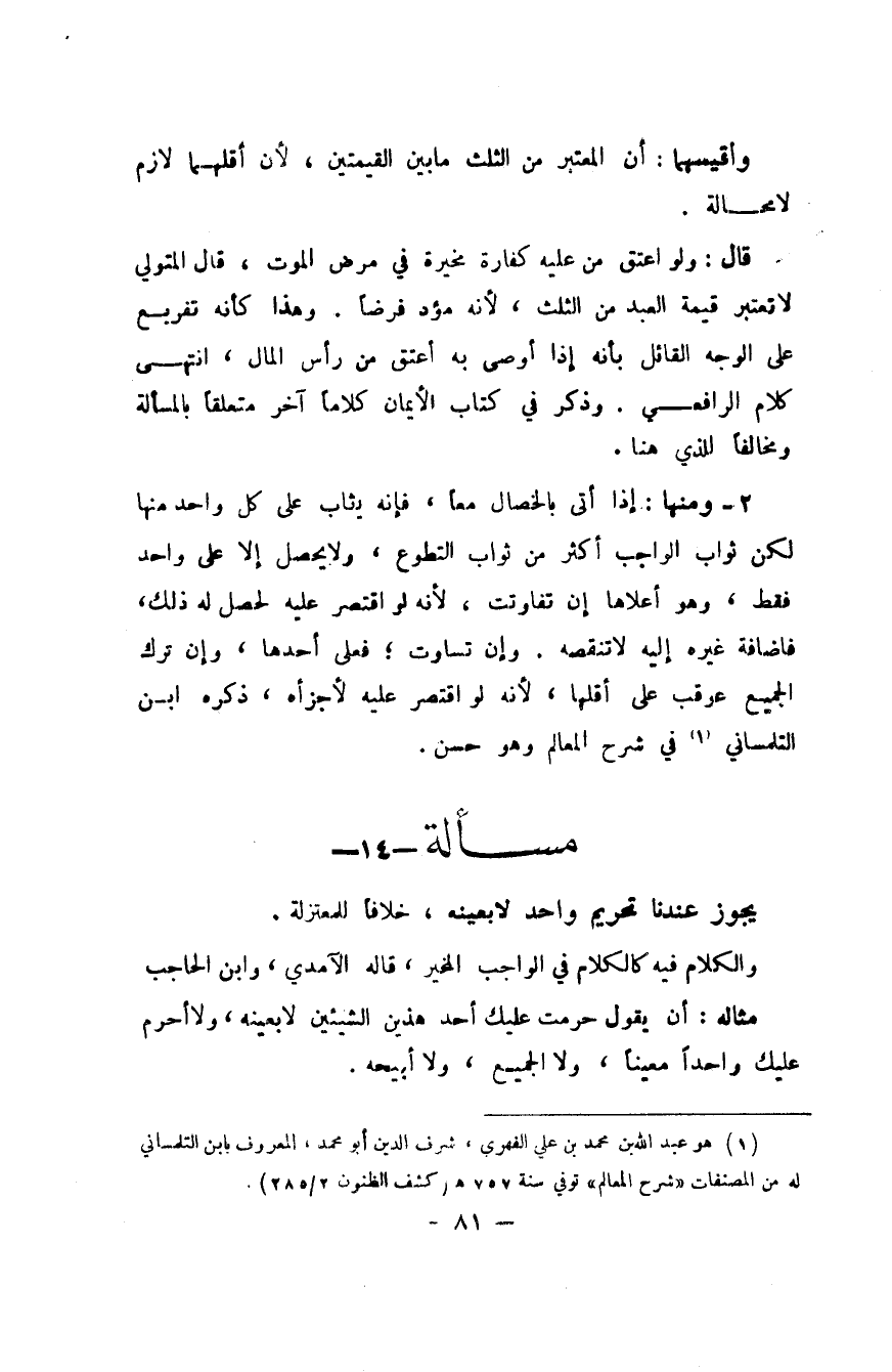 مِثَاله أَن يَقُول حرمت عَلَيْك أحد هذَيْن الشَّيْئَيْنِ لَا بِعَيْنِه وَلَا أحرم عَلَيْك وَاحِدًا معينا وَلَا الْجَمِيع وَلَا أبيحه