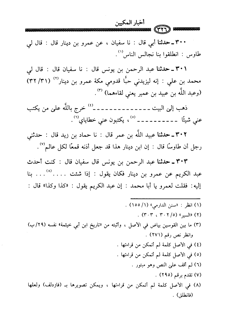 300 - حَدثنَا أبي قَالَ: نَا سُفْيَان، عَن عَمْرو بن دِينَار قَالَ: قَالَ لي طَاوس: انْطَلقُوا بِنَا نجالس النَّاس.