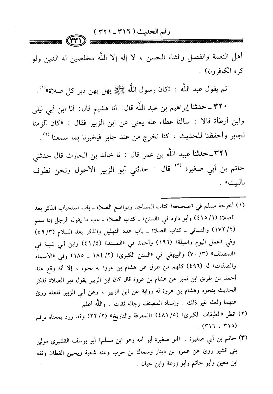 321 - حَدثنَا عبيد الله بن عمر قَالَ: نَا خَالِد بن الْحَارِث قَالَ حَدثنِي حَاتِم بن أبي صَغِيرَة قَالَ: حَدثنِي أَبُو الزبير الْأَحول وَنحن نطوف بِالْبَيْتِ ".