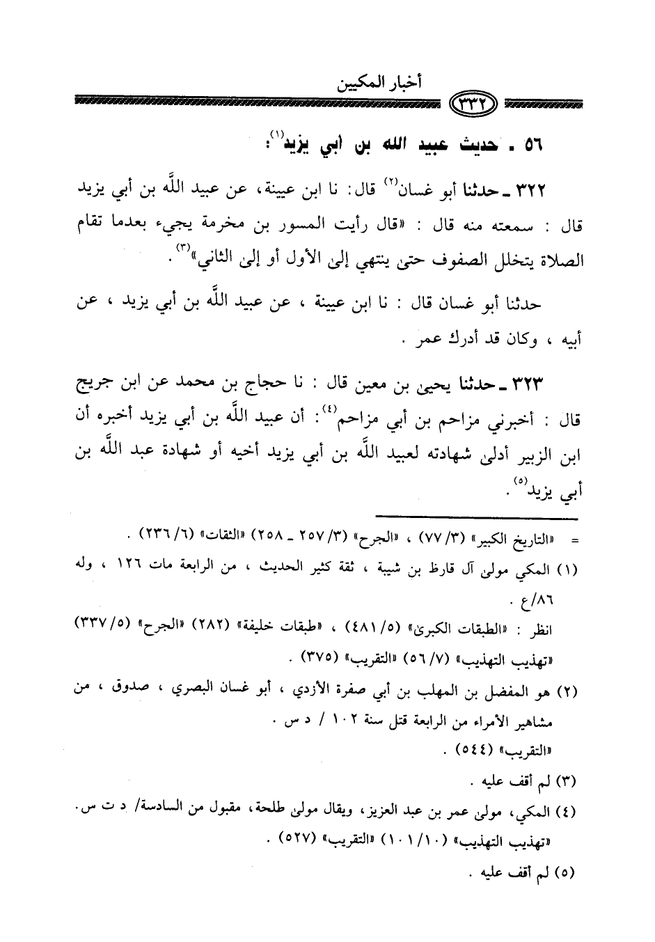 323 - حَدثنَا يحيى بن معِين قَالَ: نَا حجاج بن مُحَمَّد عَن ابْن جريج قَالَ: أَخْبرنِي مُزَاحم بن أبي مُزَاحم: أَن عبيد الله بن أبي يزِيد أخبرهُ أَن ابْن الزبير أدلى شَهَادَته لِعبيد الله بن أبي يزِيد أَخِيه أَو شَهَادَة عبد الله بن أبي يزِيد.