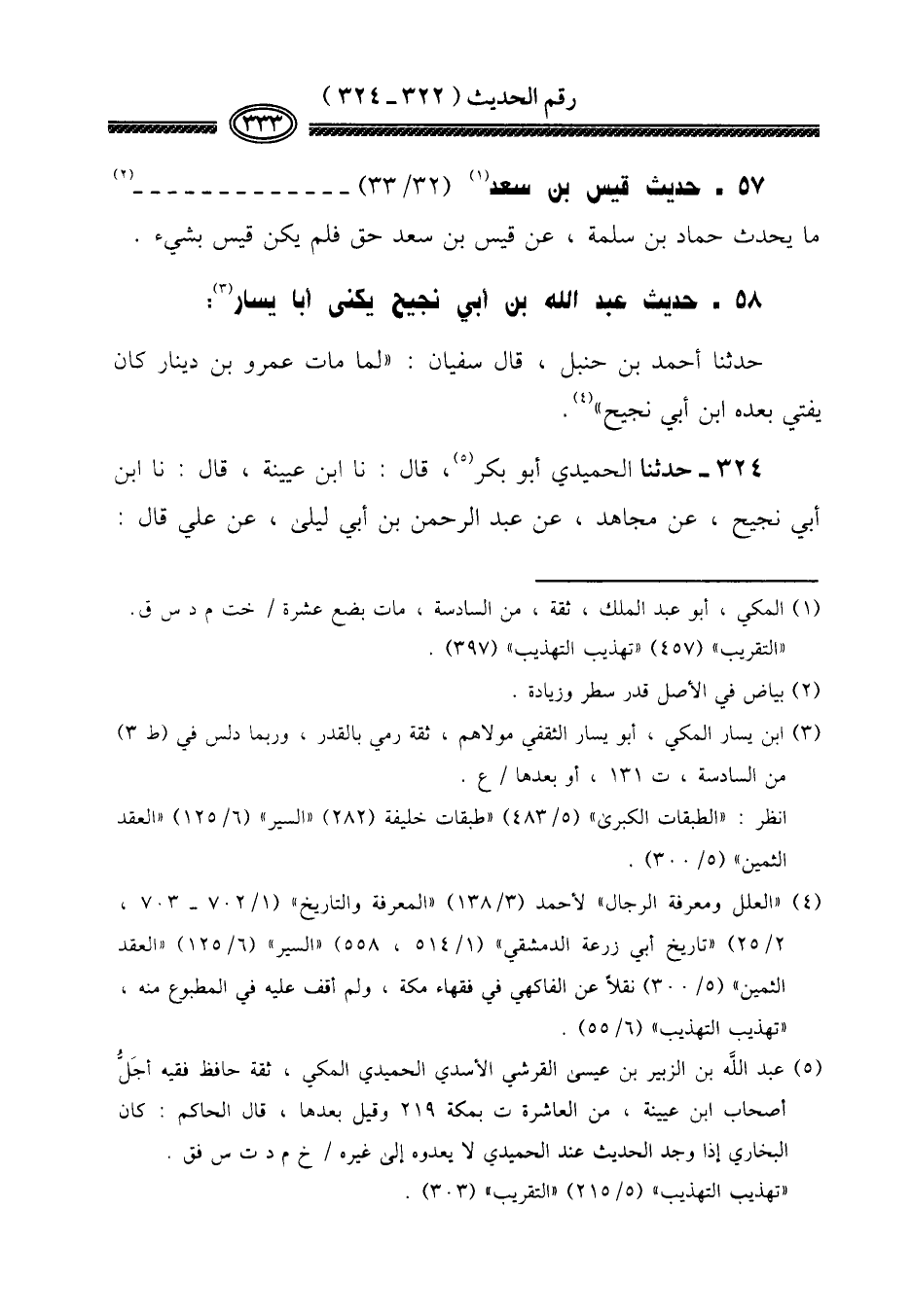 (57 - حَدِيث قيس بن سعد) (32 / 33) - مَا يحدث حَمَّاد بن سَلمَة، عَن قيس بن سعد حق فَلم يكن قيس بِشَيْء. (58 - حَدِيث عبد الله بن أبي نجيح يكنى أَبَا يسَار:)