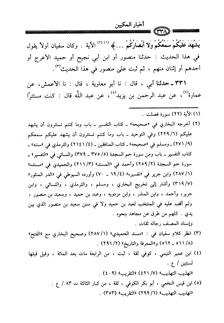 يشْهد عَلَيْكُم سمعكم وَلَا أبصاركم} الْآيَة. وَكَانَ سُفْيَان أَولا يَقُول فِي هَذَا الحَدِيث: حَدثنَا مَنْصُور أَو ابْن أبي نجيح أَو حميد الْأَعْرَج أَو أحدهم أَو إثنان مِنْهُم، ثمَّ ثَبت على مَنْصُور فِي هَذَا الحَدِيث.