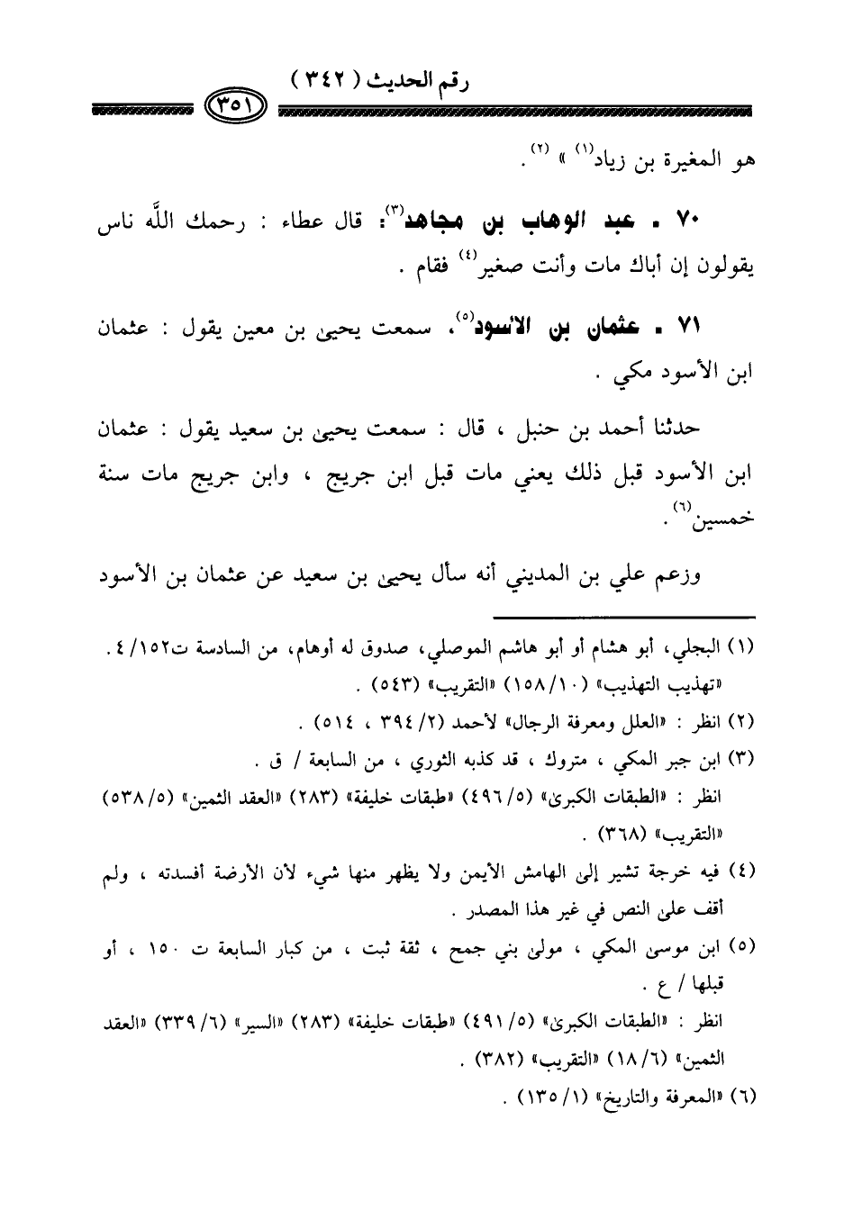 هُوَ الْمُغيرَة بن زِيَاد ". (70 - عبد الْوَهَّاب بن مُجَاهِد:) قَالَ عَطاء: رَحِمك الله نَاس يَقُولُونَ إِن أَبَاك مَاتَ وَأَنت صَغِير فَقَامَ. (71 - عُثْمَان بن الْأسود) . سَمِعت يحيى بن معِين يَقُول: عُثْمَان ابْن الْأسود مكي.