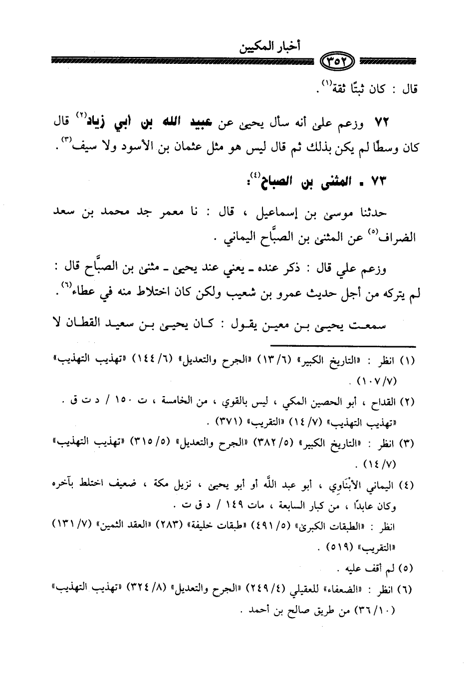 قَالَ: كَانَ ثبتاً ثِقَة. 72 - وَزعم على أَنه سَأَلَ يحيى عَن عبيد الله بن أبي زِيَاد) قَالَ كَانَ وسطا لم يكن بذلك ثمَّ قَالَ لَيْسَ هُوَ مثل عُثْمَان بن الْأسود وَلَا سيف. (73 - الْمثنى بن الصَّباح:)