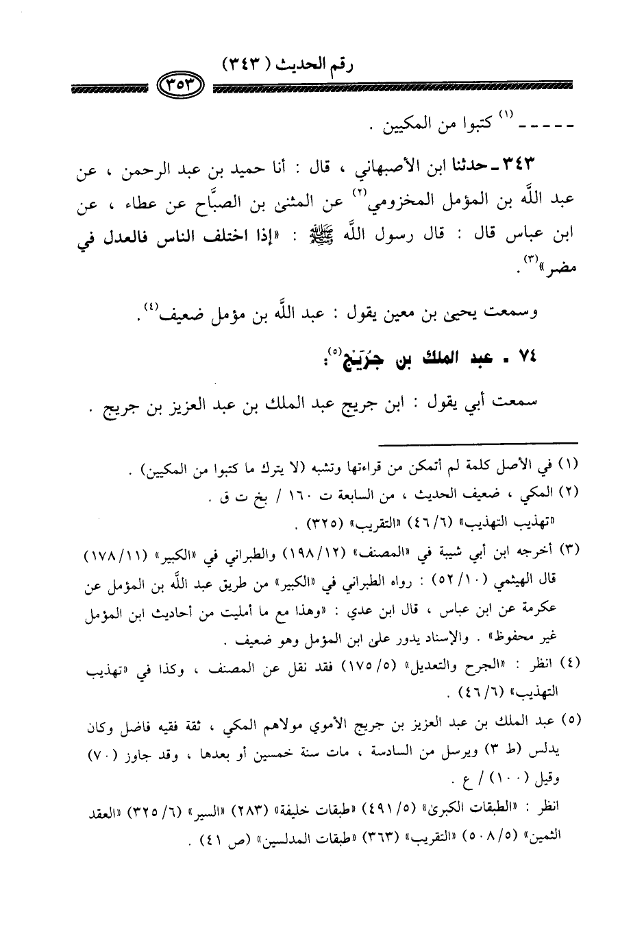 343 - حَدثنَا ابْن الْأَصْبَهَانِيّ، قَالَ: أَنا حميد بن عبد الرَّحْمَن، عَن عبد الله بن المؤمل المَخْزُومِي عَن الْمثنى بن الصبَّاح عَن عَطاء، عَن ابْن عَبَّاس قَالَ: قَالَ رَسُول الله صلى الله عَلَيْهِ وَسلم: " إِذا اخْتلف النَّاس فالعدل فِي مُضر "