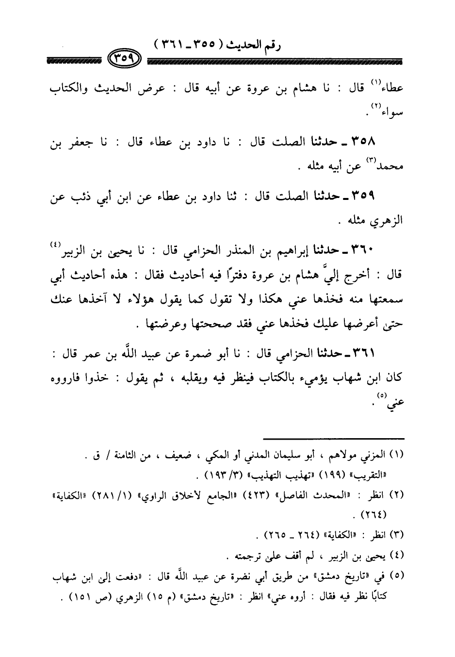 360 - حَدثنَا إِبْرَاهِيم بن الْمُنْذر الْحزَامِي قَالَ: نَا يحيى بن الزبير قَالَ: أخرج إليَّ هِشَام بن عُرْوَة دفتراً فِيهِ أَحَادِيث فَقَالَ: هَذِه أَحَادِيث أبي سَمعتهَا مِنْهُ فَخذهَا عني هَكَذَا وَلَا تَقول كَمَا يَقُول هَؤُلَاءِ لَا آخذها عَنْك حَتَّى أعرضها عَلَيْك فَخذهَا عني فقد صححتها وعرضتها.