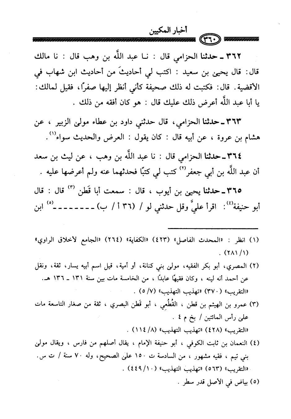365 - حَدثنَا يحيى بن أَيُّوب، قَالَ: سَمِعت أَبَا قَطن قَالَ: قَالَ أَبُو حنيفَة: اقْرَأ عليَّ وَقل حَدثنِي لَو / 36 أ / ب) - ابْن