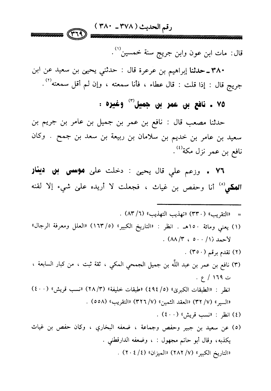380 - حَدثنَا إِبْرَاهِيم بن عرْعرة قَالَ: حَدثنِي يحيى بن سعيد عَن ابْن جريج قَالَ: إِذا قلت: قَالَ عَطاء، فَأَنا سمعته، وَإِن لم أقل سمعته. (75 - نَافِع بن عمر بن جميل وَغَيره:)