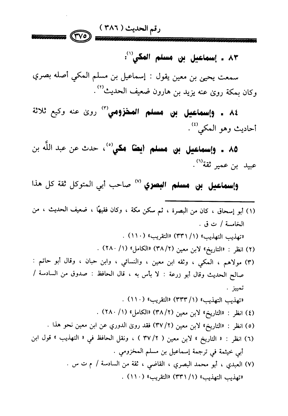 سَمِعت يحيى بن معِين يَقُول: إِسْمَاعِيل بن مُسلم الْمَكِّيّ أَصله بَصرِي وَكَانَ بِمَكَّة روى عَنهُ يزِيد بن هَارُون ضَعِيف الحَدِيث. (84 - وَإِسْمَاعِيل بن مُسلم المَخْزُومِي) روى عَنهُ وَكِيع ثَلَاثَة أَحَادِيث وَهُوَ الْمَكِّيّ. (85 - وَإِسْمَاعِيل بن مُسلم أَيْضا مكي،) حدث عَن عبد الله بن عبيد بن عُمَيْر ثِقَة.