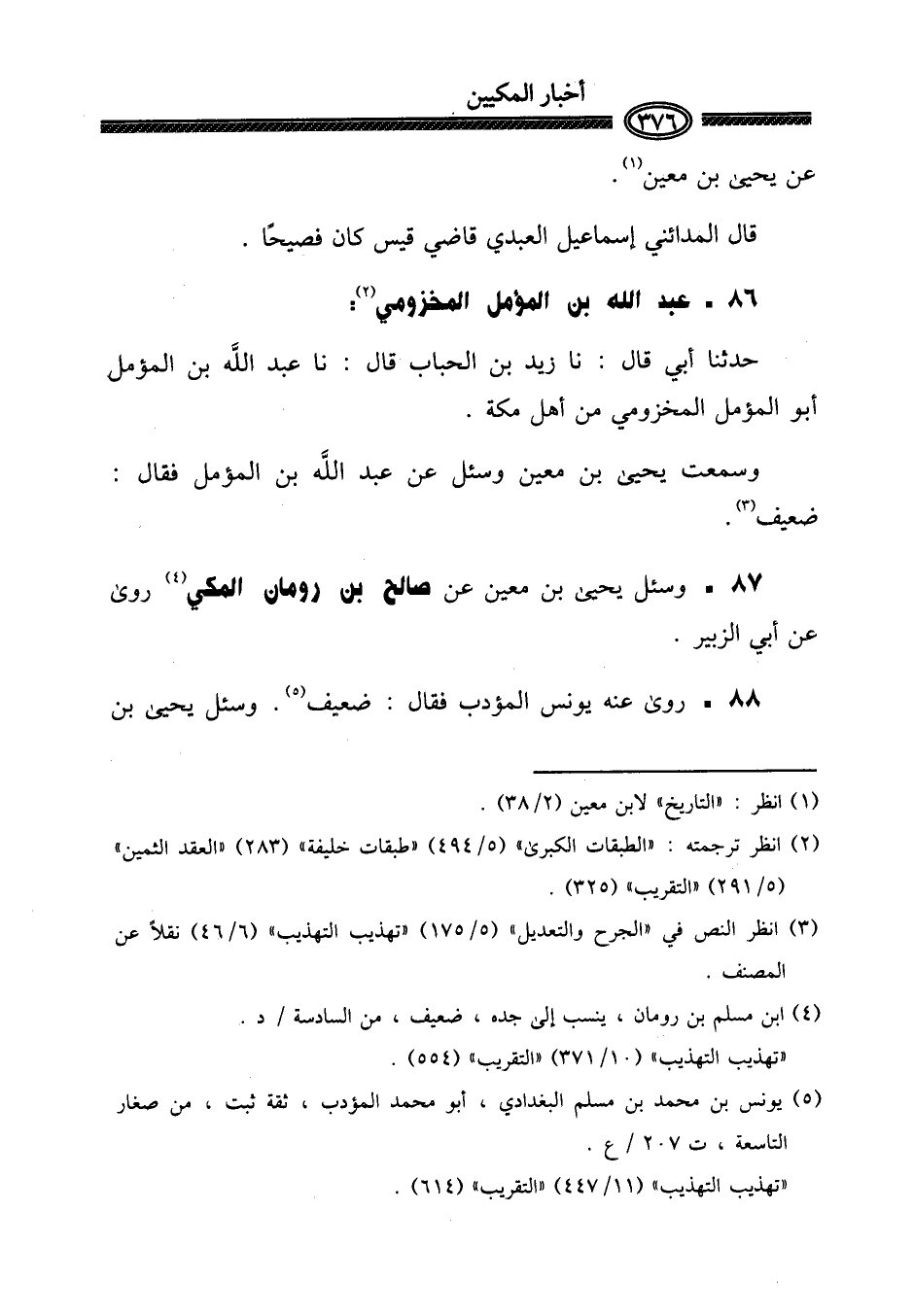 87 - وَسُئِلَ يحيى بن معِين عَن (صَالح بن رُومَان الْمَكِّيّ) روى عَن أبي الزبير.