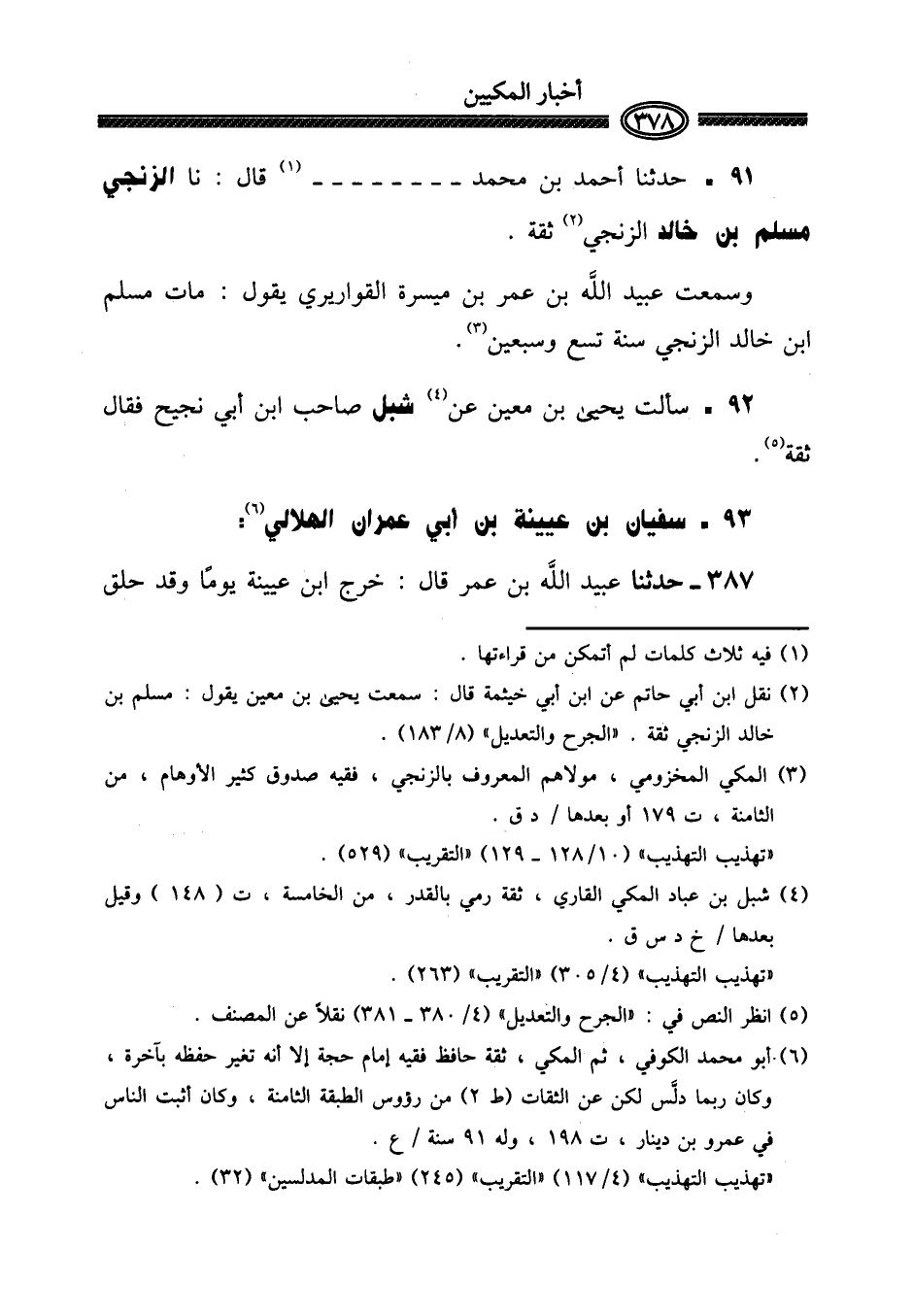 92 - سَأَلت يحيى بن معِين عَن (شبْل) صَاحب ابْن أبي نجيح فَقَالَ ثِقَة. (93 - سُفْيَان بن عُيَيْنَة بن أبي عمرَان الْهِلَالِي:)
