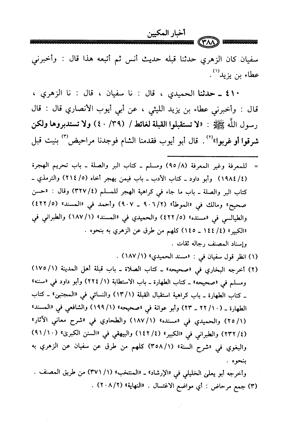 410 - حَدثنَا الْحميدِي، قَالَ: نَا سُفْيَان، قَالَ: نَا الزُّهْرِيّ، قَالَ: وَأَخْبرنِي عَطاء بن يزِيد اللَّيْثِيّ، عَن أبي أَيُّوب الْأنْصَارِيّ قَالَ: قَالَ رَسُول الله صلى الله عَلَيْهِ وَسلم: " لَا تستقبلوا الْقبْلَة لغائط / (39 / 40) وَلَا تستدبروها وَلَكِن شرقوا أَو غربوا ". قَالَ أَبُو أَيُّوب فقدمنا الشَّام فَوَجَدنَا مراحيض بنيت قبل