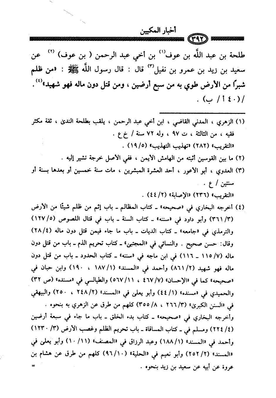 طَلْحَة بن عبد الله بن عَوْف بن أخي عبد الرَّحْمَن (بن عَوْف) عَن سعيد بن زيد بن عَمْرو بن نفَيْل قَالَ: قَالَ رَسُول الله صلى الله عَلَيْهِ وَسلم: " من ظلم شبْرًا من الأَرْض طوي بِهِ من سبع أَرضين، وَمن قتل دون مَاله فَهُوَ شَهِيد ". / (40 أ / ب) .