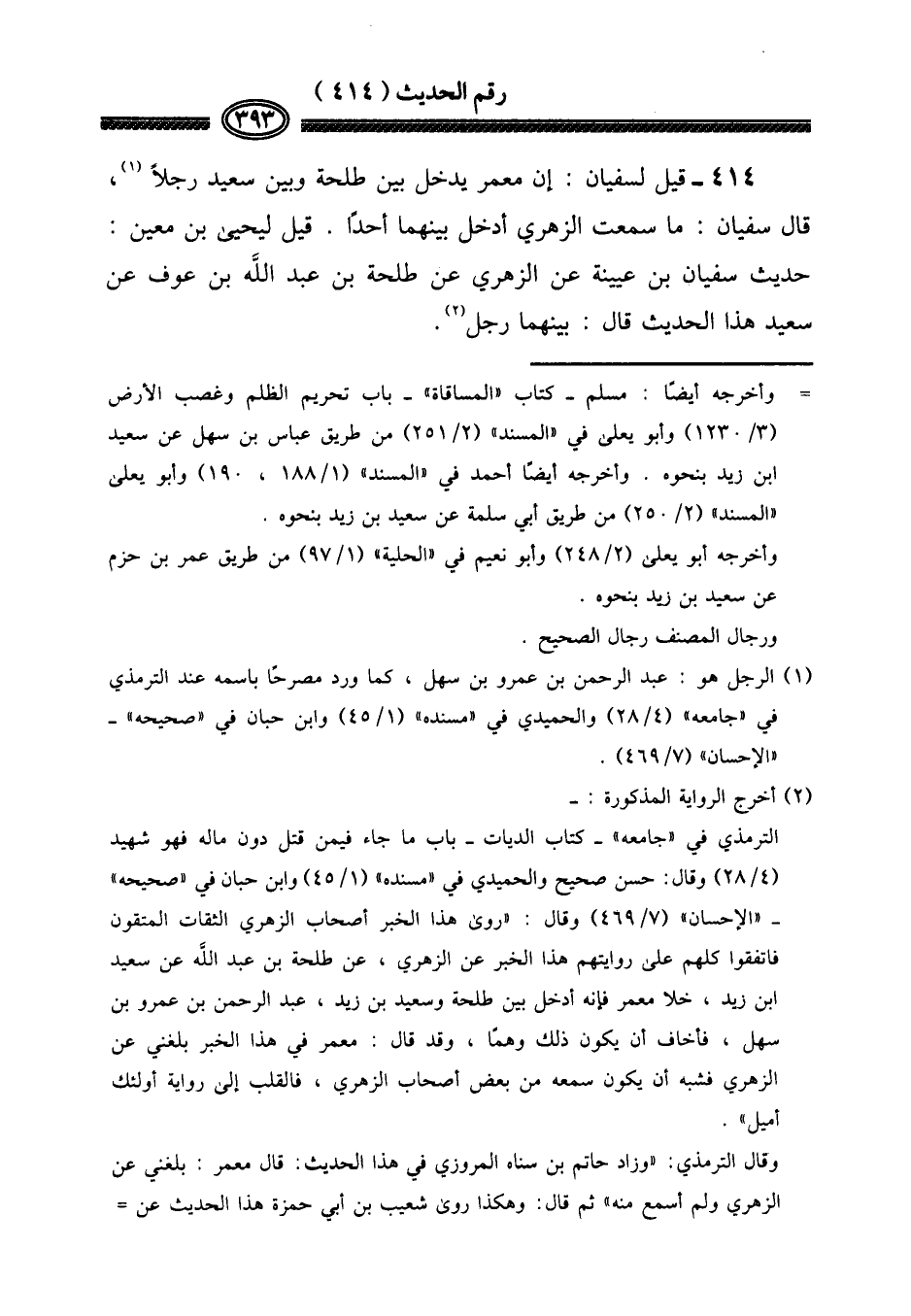 414 - قيل لِسُفْيَان: إِن معمر يدْخل بَين طَلْحَة وَبَين سعيد رجلا، قَالَ سُفْيَان: مَا سَمِعت الزُّهْرِيّ أَدخل بَينهمَا أحدا. قيل ليحيى بن معِين: حَدِيث سُفْيَان بن عُيَيْنَة عَن الزُّهْرِيّ عَن طَلْحَة بن عبد الله بن عَوْف عَن سعيد هَذَا الحَدِيث قَالَ: بَينهمَا رجل.