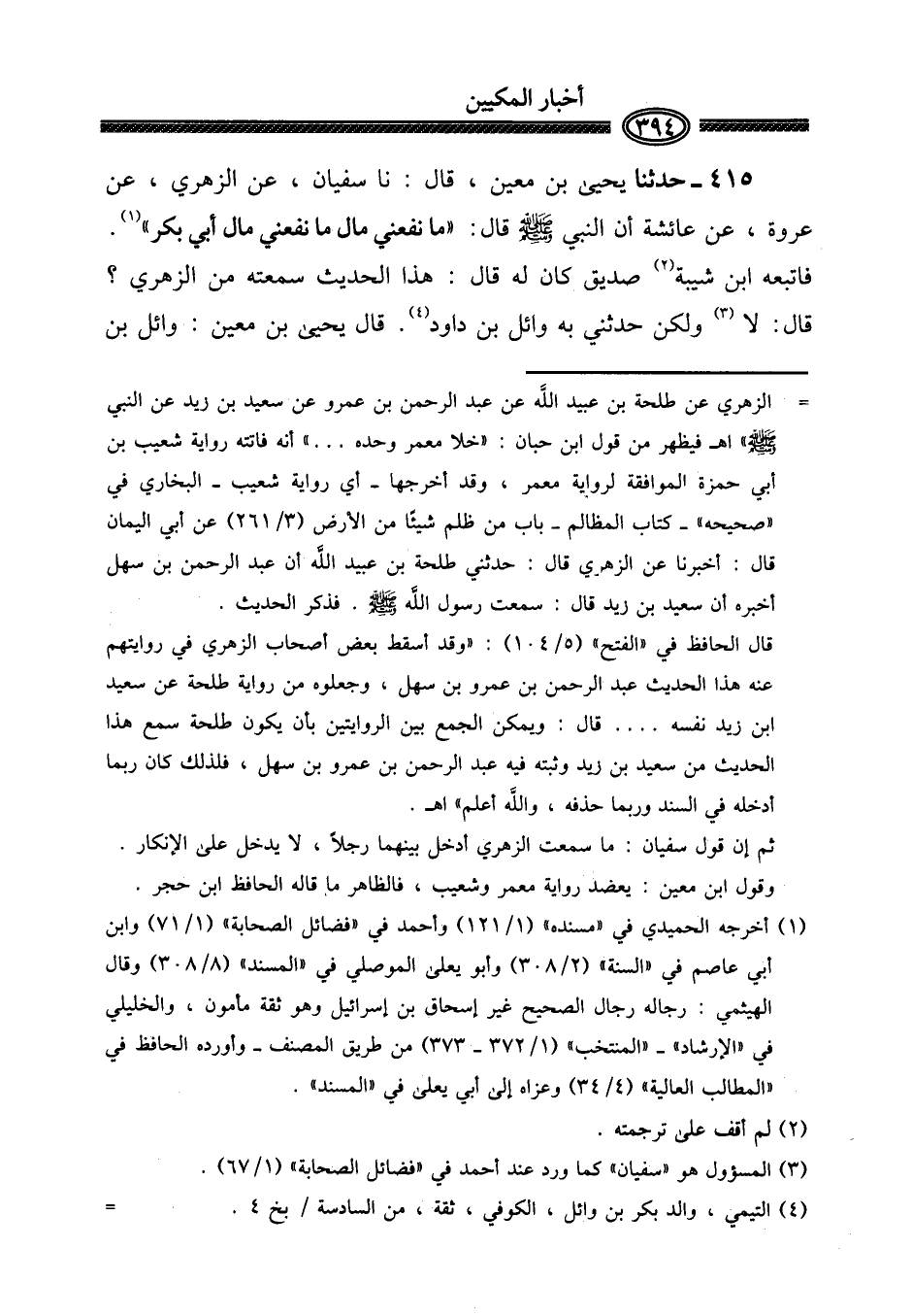 415 - حَدثنَا يحيى بن معِين، قَالَ: نَا سُفْيَان، عَن الزُّهْرِيّ، عَن عُرْوَة، عَن عَائِشَة أَن النَّبِي صلى الله عَلَيْهِ وَسلم قَالَ: " مَا نَفَعَنِي مَال مَا نَفَعَنِي أبي بكر ". فَاتبعهُ ابْن شيبَة صديق كَانَ لَهُ قَالَ: هَذَا الحَدِيث سمعته من الزُّهْرِيّ؟ قَالَ: لَا وَلَكِن حَدثنِي بِهِ وَائِل بن دَاوُد. قَالَ يحيى بن معِين: وَائِل بن