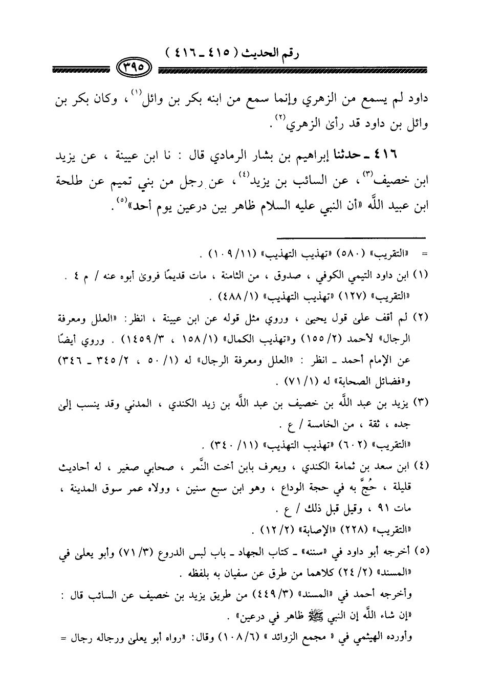 416 - حَدثنَا إِبْرَاهِيم بن بشار الرَّمَادِي قَالَ: نَا ابْن عُيَيْنَة، عَن يزِيد ابْن خصيف، عَن السَّائِب بن يزِيد، عَن رجل من بني تَمِيم عَن طَلْحَة ابْن عبيد الله " أَن النَّبِي عَلَيْهِ السَّلَام ظَاهر بَين درعين يَوْم أحد ".