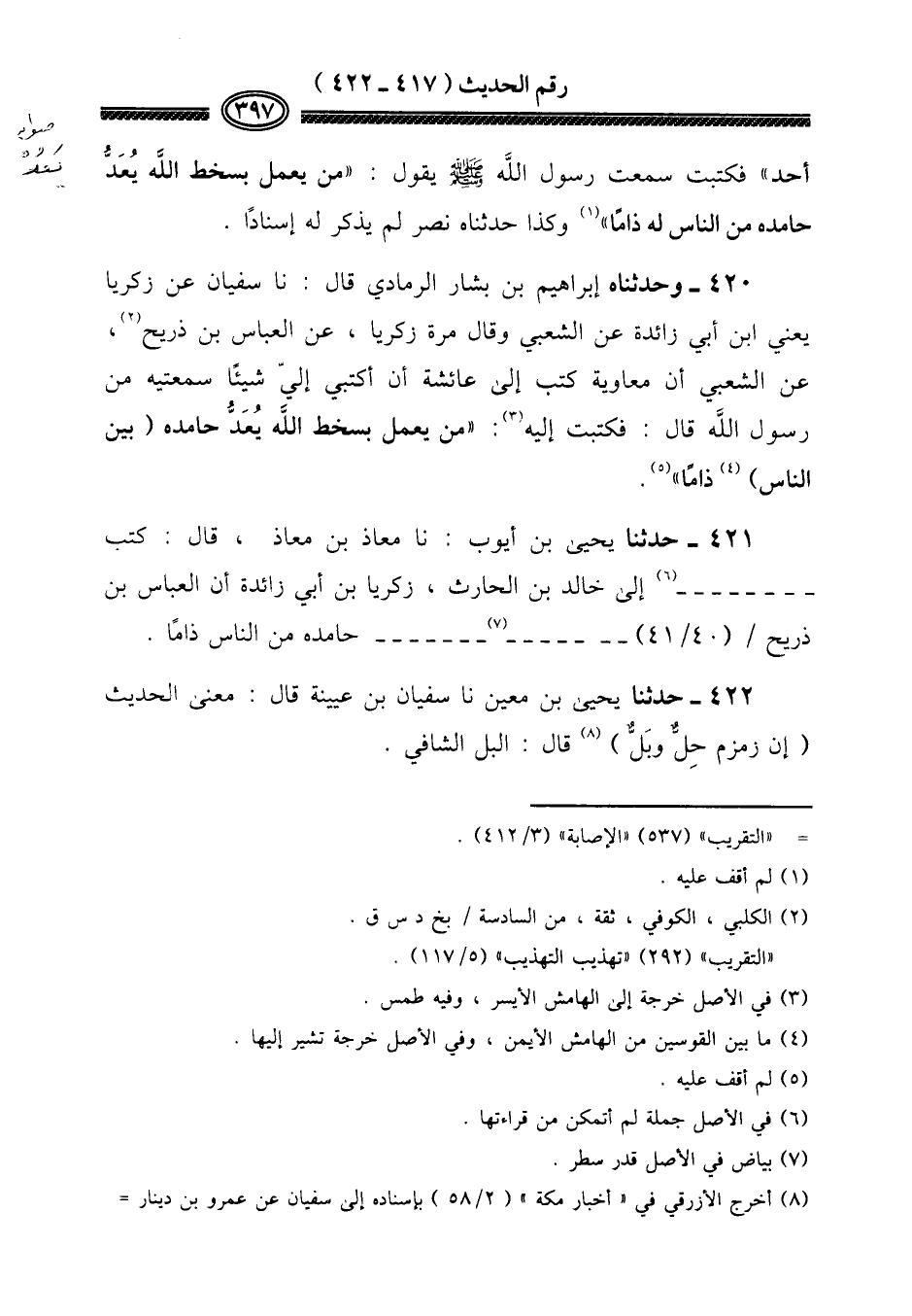 420 - وحدثناه إِبْرَاهِيم بن بشار الرَّمَادِي قَالَ: نَا سُفْيَان عَن زَكَرِيَّا يَعْنِي ابْن أبي زَائِدَة عَن الشّعبِيّ وَقَالَ مرّة زَكَرِيَّا، عَن الْعَبَّاس بن ذريح، عَن الشّعبِيّ أَن مُعَاوِيَة كتب إِلَى عَائِشَة أَن أكتبي إليّ شَيْئا سمعتيه من رَسُول الله قَالَ: فَكتبت إِلَيْهِ. " من يعْمل بسخط الله يعَدّ حامده (بَين النَّاس) ذاماً ".