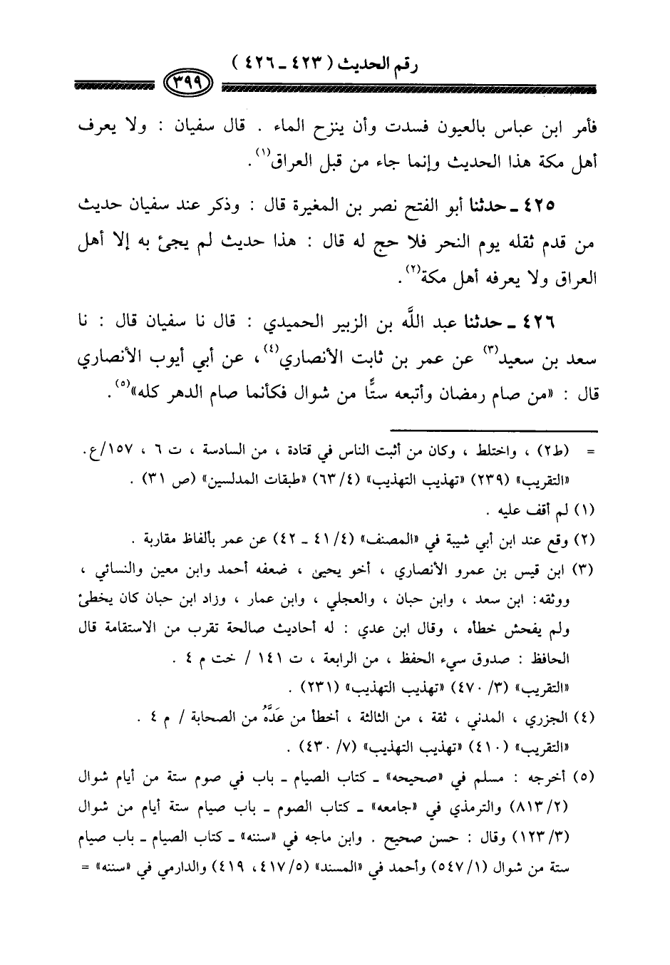 426 - حَدثنَا عبد الله بن الزبير الْحميدِي: قَالَ نَا سُفْيَان قَالَ: نَا سعد بن سعيد عَن عمر بن ثَابت الْأنْصَارِيّ، عَن أبي أَيُّوب الْأنْصَارِيّ قَالَ: " من صَامَ رَمَضَان وَأتبعهُ ستًّا من شَوَّال فَكَأَنَّمَا صَامَ الدَّهْر كُله ".