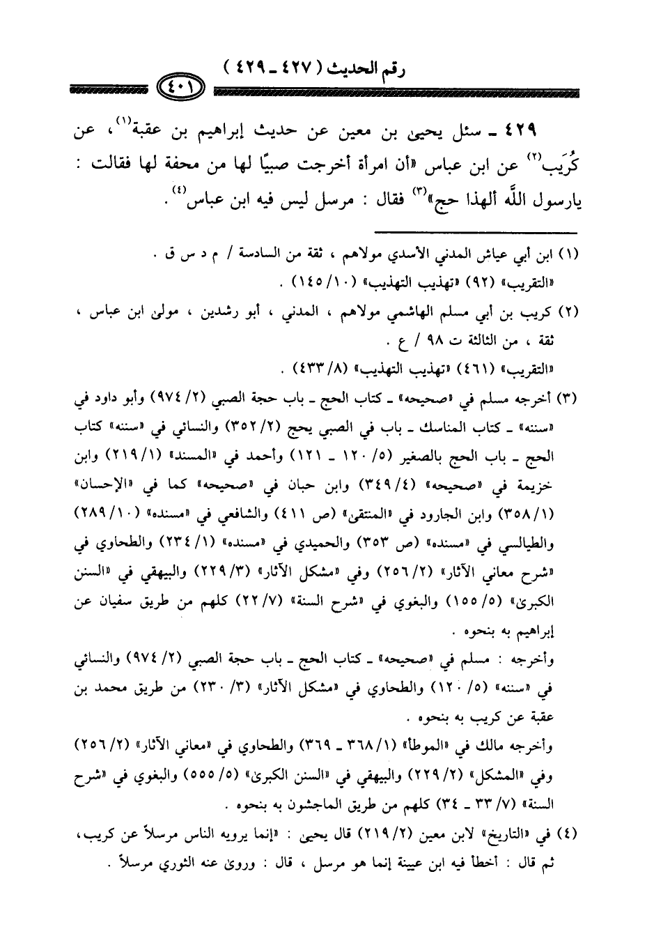429 - سُئِلَ يحيى بن معِين عَن حَدِيث إِبْرَاهِيم بن عقبَة، عَن كرَيب عَن ابْن عَبَّاس " أَن امْرَأَة أخرجت صَبيا لَهَا من محفة لَهَا فَقَالَت: يَا رَسُول الله أَلِهَذَا حج " فَقَالَ: مُرْسل لَيْسَ فِيهِ ابْن عَبَّاس.