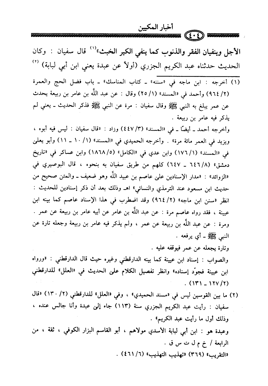 الْأَجَل وينفيان الْفقر والذنُوب كَمَا يَنْفِي الْكِير الْخبث " قَالَ سُفْيَان: وَكَانَ الحَدِيث حدّثنَاهُ عبد الْكَرِيم الْجَزرِي (أَولا عَن عَبدة يَعْنِي ابْن أبي لبَابَة)