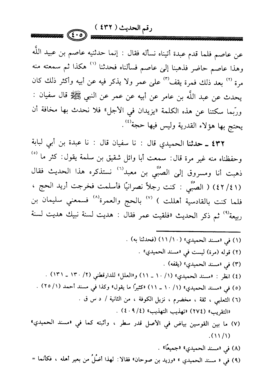 432 - حَدثنَا الْحميدِي قَالَ: نَا سُفْيَان قَالَ: نَا عَبدة بن أبي لبَابَة وحفظناه مِنْهُ غير مرّة قَالَ: سَمِعت أَبَا وَائِل شَقِيق بن سَلمَة يَقُول: كثر مَا ذهبت أَنا ومسروق إِلَى الصبَّي بن معبد نستذكره هَذَا الحَدِيث فَقَالَ (41 / 42) (الصبَّي: كنت رجلا نَصْرَانِيّا فَأسْلمت فَخرجت أُرِيد الْحَج، فَلَمَّا كنت بالقادسية أَهلَلْت) بِالْحَجِّ وَالْعمْرَة فسمعني سُلَيْمَان بن ربيعَة ثمَّ ذكر الحَدِيث " فَلَقِيت عمر فَقَالَ: هديت لسنة نبيك هديت لسنة