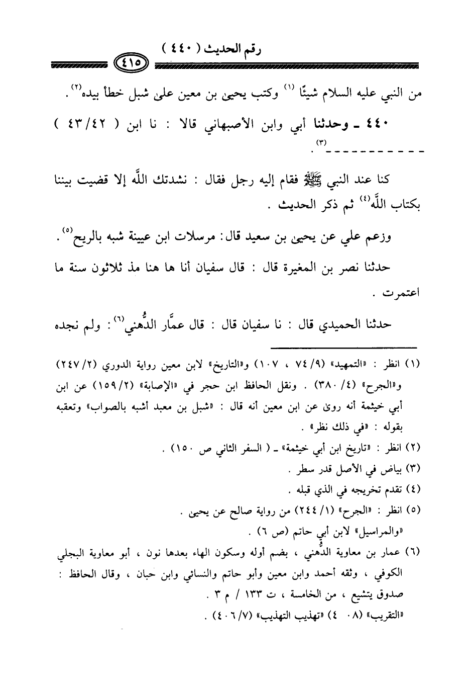 من النَّبِي عَلَيْهِ السَّلَام شَيْئا وَكتب يحيى بن معِين على شبْل خطأ بِيَدِهِ.