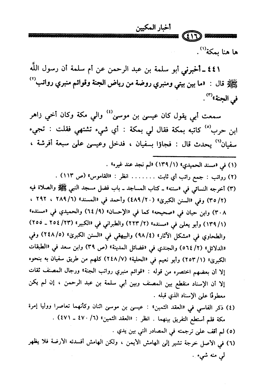 441 - أَخْبرنِي أَبُو سَلمَة بن عبد الرَّحْمَن عَن أم سَلمَة أَن رَسُول الله صلى الله عَلَيْهِ وَسلم قَالَ: " مَا بَين بَيْتِي ومنبري رَوْضَة من رياض الْجنَّة وقوائم منبري رواتب فِي الْجنَّة ".