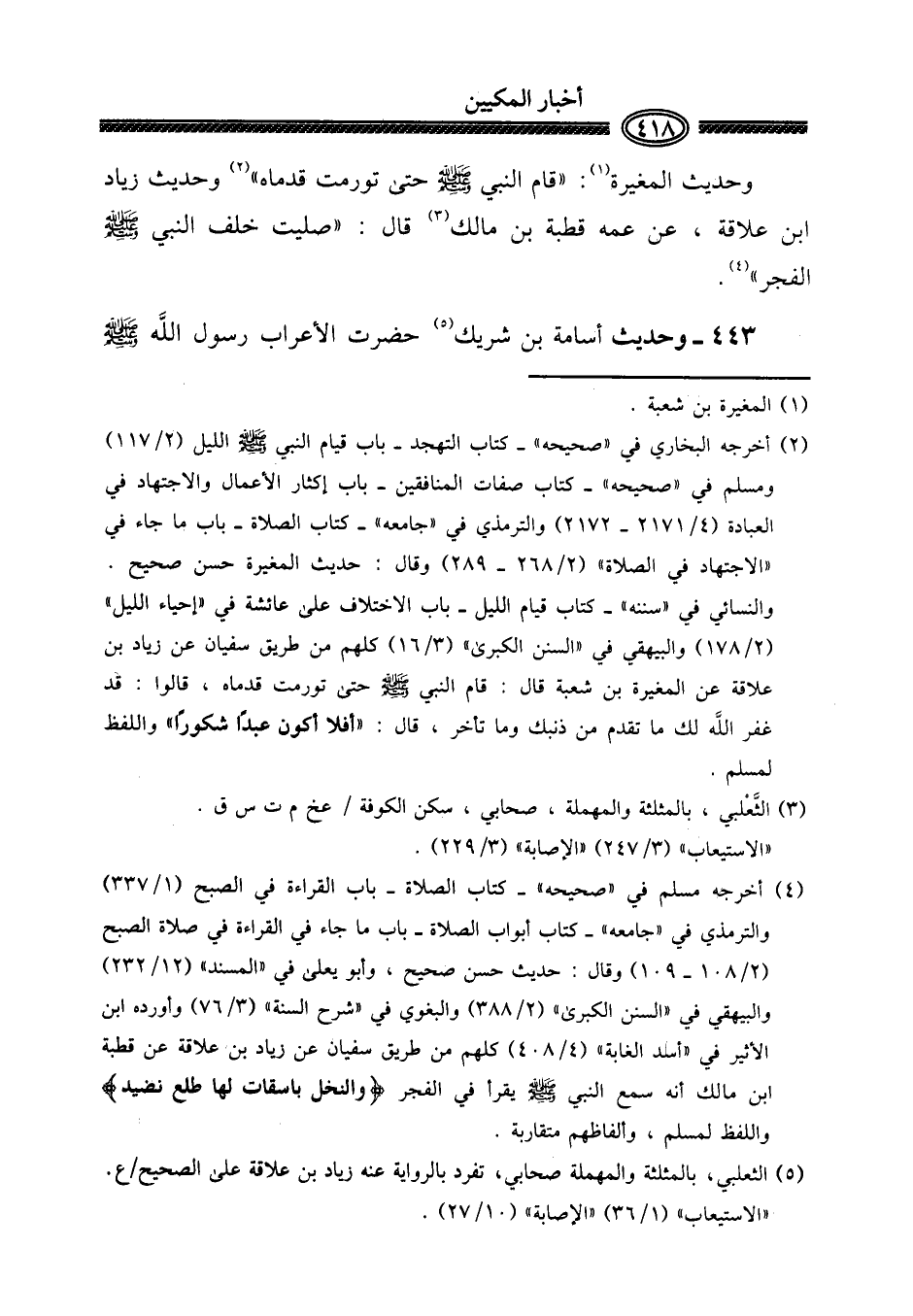وَحَدِيث الْمُغيرَة: " قَامَ النَّبِي صلى الله عَلَيْهِ وَسلم حَتَّى تورمت قدماه " وَحَدِيث زِيَاد ابْن علاقَة، عَن عَمه قُطْبَة بن مَالك قَالَ: " صليت خلف النَّبِي صلى الله عَلَيْهِ وَسلم الْفجْر ".