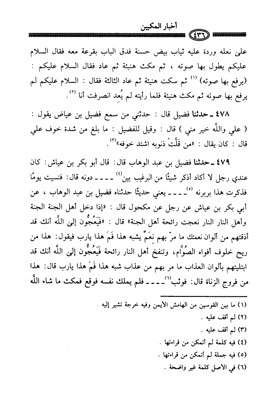 479 - حَدثنَا فُضَيْل بن عبد الْوَهَّاب قَالَ: قَالَ أَبُو بكر بن عَيَّاش: كَانَ عِنْدِي رجل لَا أكاد أذكر شَيْئا من البرغيب بَين - دونه قَالَ: فنسيت يَوْمًا فَذكرت هَذَا بربرنه - يَعْنِي حَدِيثا حدّثنَاهُ فُضَيْل بن عبد الْوَهَّاب، عَن أبي بكر بن عَيَّاش عَن رجل عَن مَكْحُول قَالَ: " إِذا دخل أهل الْجنَّة الْجنَّة وَأهل النَّار النَّار نعجت رَائِحَة أهل الْجنَّة " قَالَ: " فَيَعجّون إِلَى الله أَنَّك قد أذقتهم من ألوان نِعْمَتك مَا مرّ بهم نِعَم يشبه هَذَا فَمَ هَذَا يَا رب فَيَقُول: هَذَا من ريح خلوف أَفْوَاه الصوَّام، وتنفخ أهل النَّار رَائِحَة فَيَعجّون إِلَى الله أَنَّك قد ابتليتهم بألوان الْعَذَاب مَا مر بهم من عَذَاب شبه هَذَا فَمَ هَذَا يَا رب قَالَ: هَذَا من فروج الزناة قَالَ: فَوَثَبَ - فَلم يملك نَفسه فَوَقع فَمَكثَ مَا شَاءَ الله