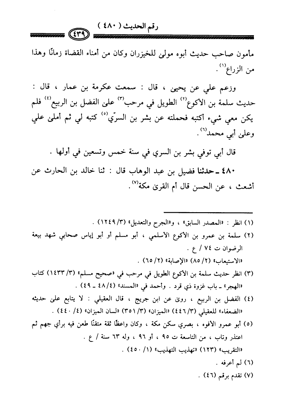 وَزعم عَليّ عَن يحيى، قَالَ: سَمِعت عِكْرِمَة بن عمار، قَالَ: حَدِيث سَلمَة بن الْأَكْوَع الطَّوِيل فِي مرحب على الْفضل بن الرّبيع فَلم يكن معي شَيْء أكتبه فَحَملته عَن بشر بن السرّي كتبه لي ثمَّ أملي عَليّ وعَلى أبي مُحَمَّد.