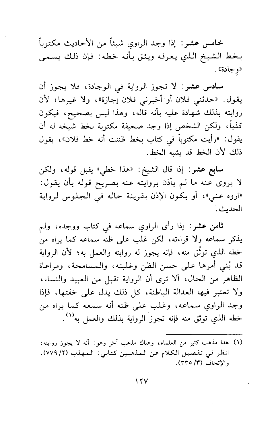 سادس عشر: لا تجوز الرواية في الوجادة، فلا يجوز أن يقول: " حدثني فلان أو أخبرني فلان إجازة "، ولا غيرها؛ لأن روايته بذلك شهادة عليه بأنه قاله، وهذا ليس بصحيح، فيكون كذباً، ولكن الشخص إذا وجد صحيفة مكتوبة بخط شيخه له أن يقول: " رأيت مكتوباً في كتاب بخط ظننت أنه خط فلان "، يقول ذلك لأن الخط قد يشبه الخط.