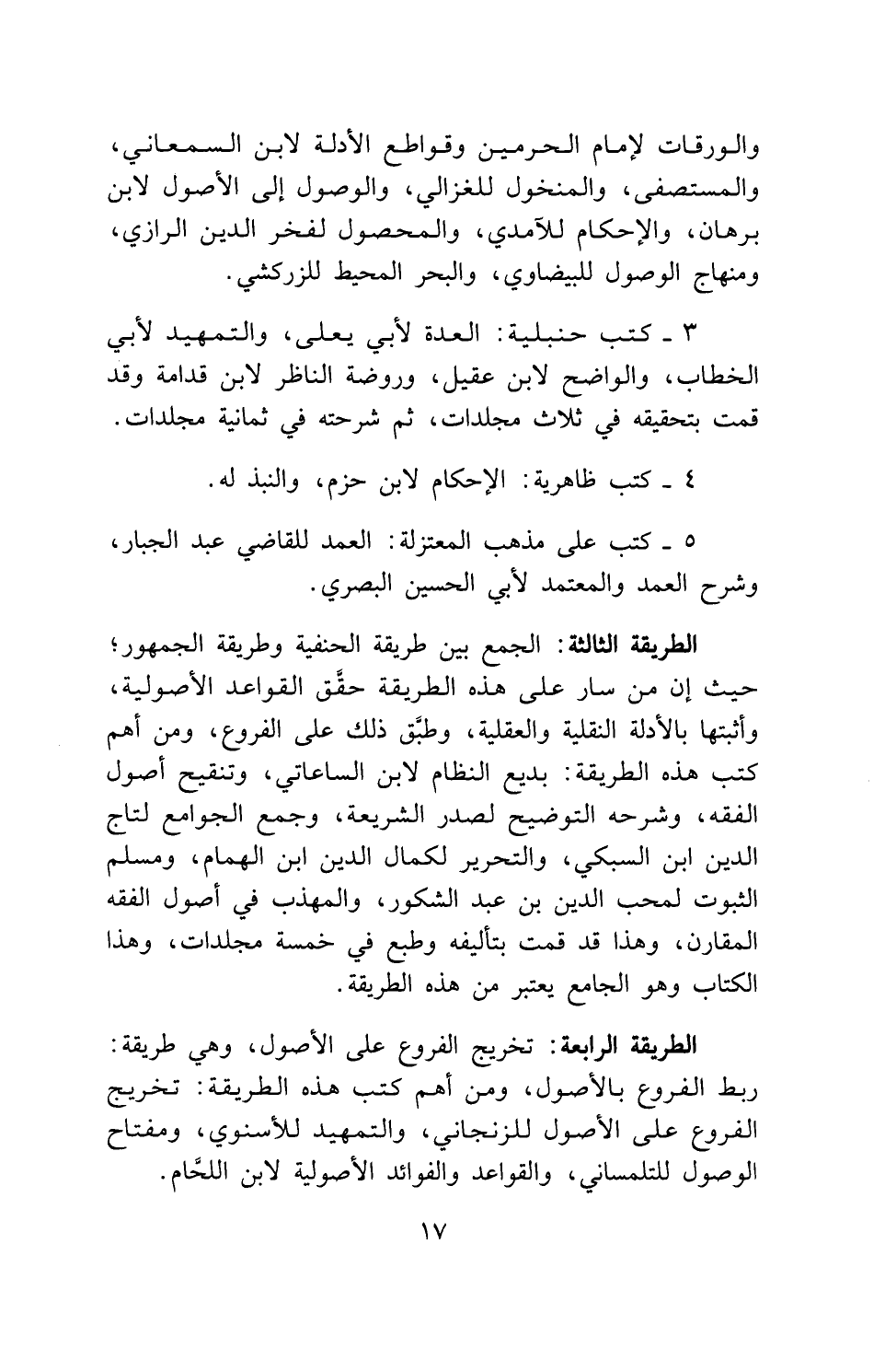 3 - كتب حنبلية: العدة لأبي يعلى، والتمهيد لأبي الخطاب، والواضح لابن عقيل، وروضة الناظر لابن قدامة وقد قمت بتحقيقه في ثلاث مجلدات، ثم شرحته في ثمانية مجلدات.