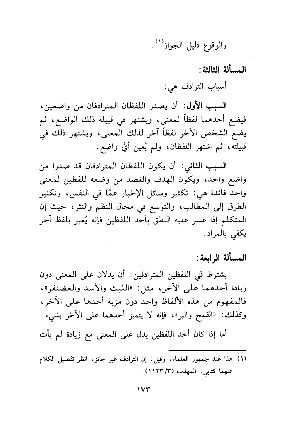 يشترط في اللفظين المترادفين: أن يدلان على المعنى دون زيادة أحدهما على الآخر، مثل: " الليث والأسد والغضنفر "، فالمفهوم من هذه الألفاظ واحد دون مزية أحدها على الآخر، وكذلك: " القمح والبر "، فإنه لا يتميز أحدهما على الآخر بشيء.