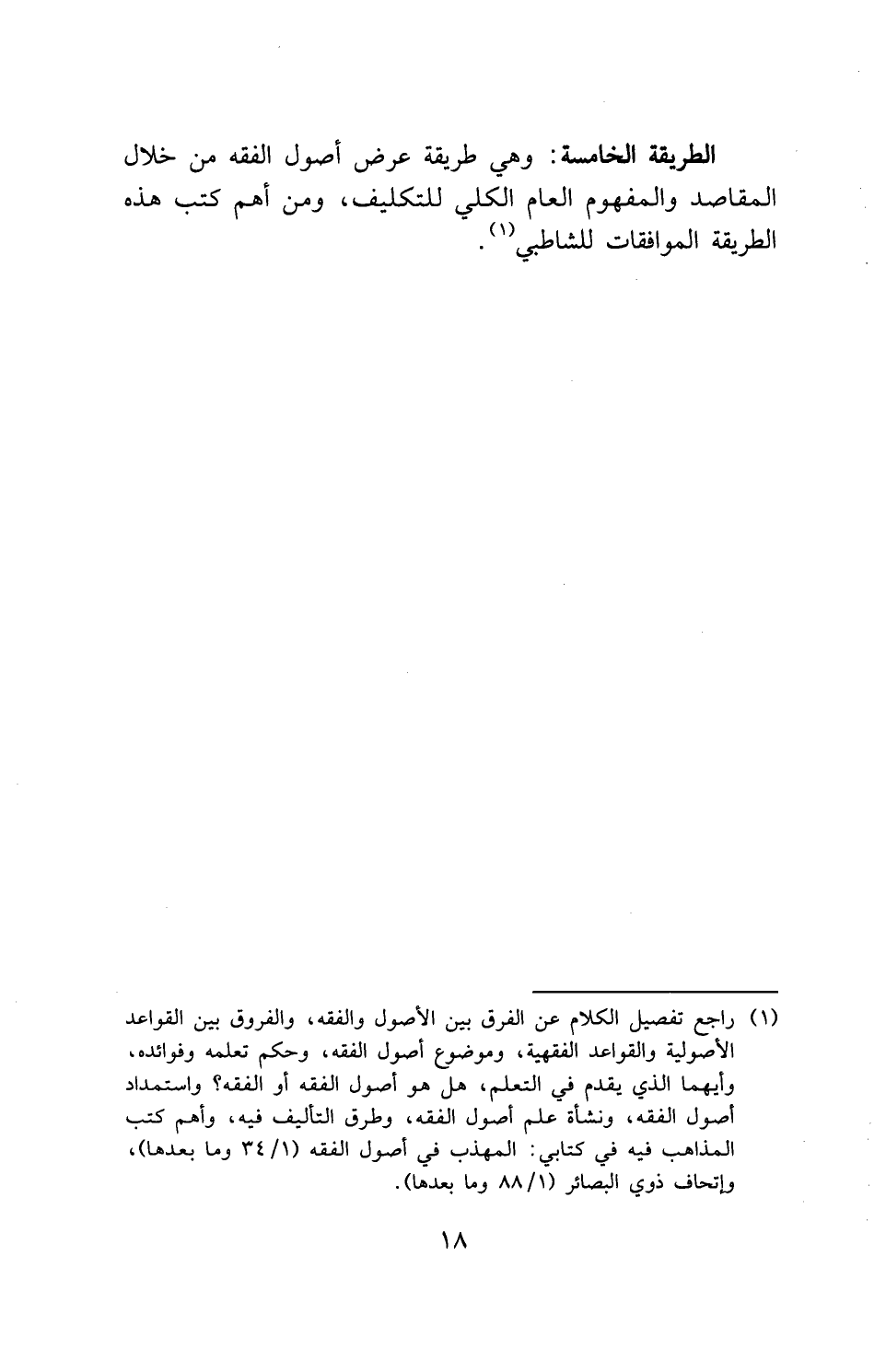 الطريقة الخامسة: وهي طريقة عرض أصول الفقه من خلال المقاصد والمفهوم العام الكلي للتكليف، ومن أهم كتب هذه الطريقة الموافقات للشاطبي.